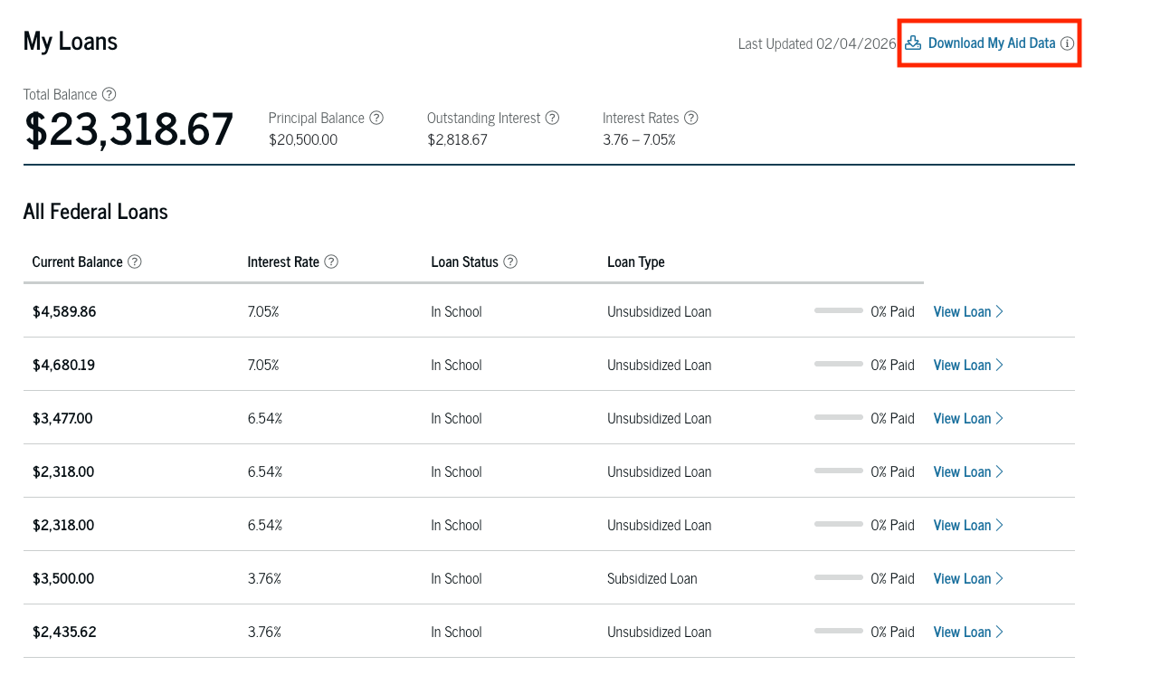 3.    On the “View My Loans” page, click the blue link that says “Download My Aid Data”.